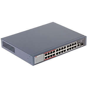 Switch 24 puertos 10/100 PoE, 1 puerto 10/100/1000, 1 puerto SFP 1000Mb, tecnologia de larga distancia para conexión de hasta 250 metros. 30W por puerto PoE. Marca Hikvision
